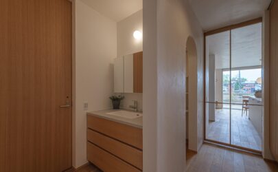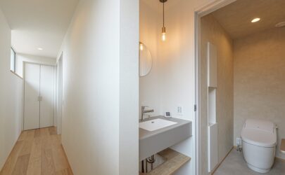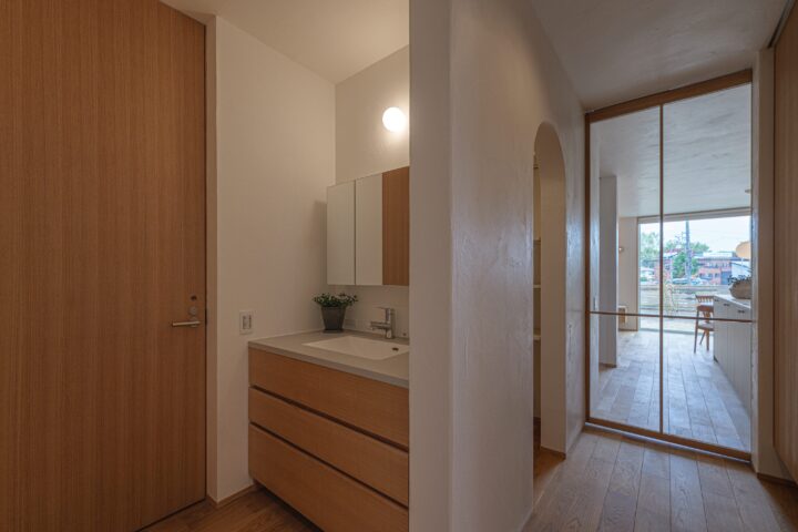 • トイレ前の洗面コーナー。リビング入り口は開放的なガラス戸に。