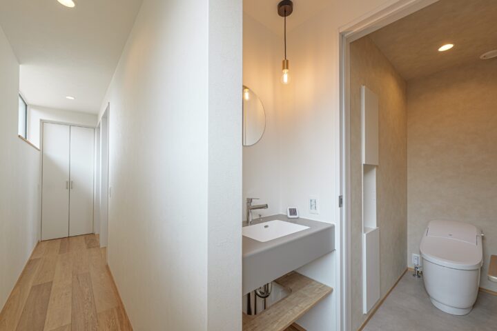 • 照明と丸いミラーがかわいい2階の洗面コーナーとトイレ。