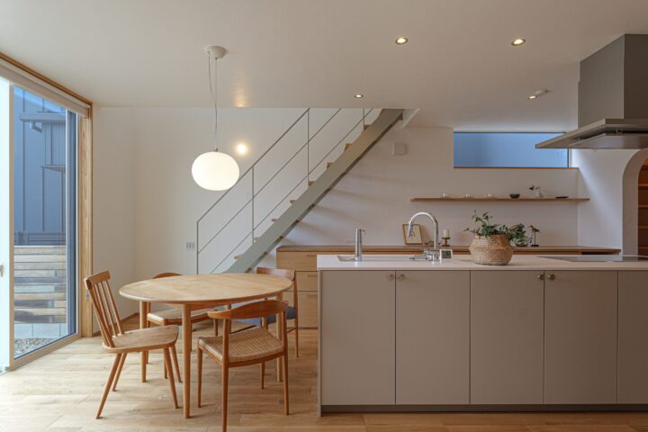 • キッチン、階段のグレーと自然素材の組み合わせが素敵です。