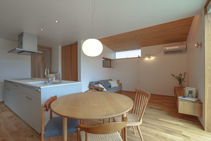 • リビングは無垢板張りの勾配天井になっています。